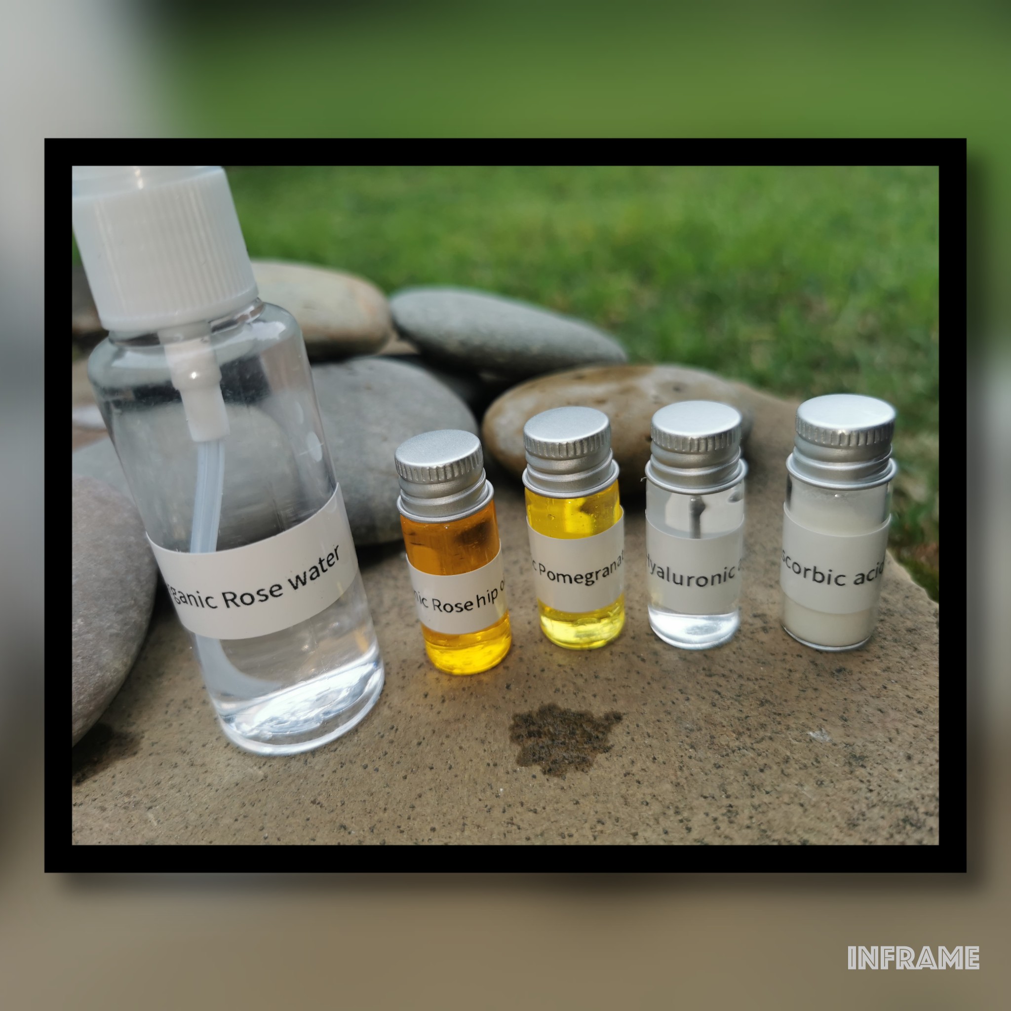 It contains Hyaluronic Acid, Rosehip oil, Pomegranate oil, Vit C and Organic Rose water.