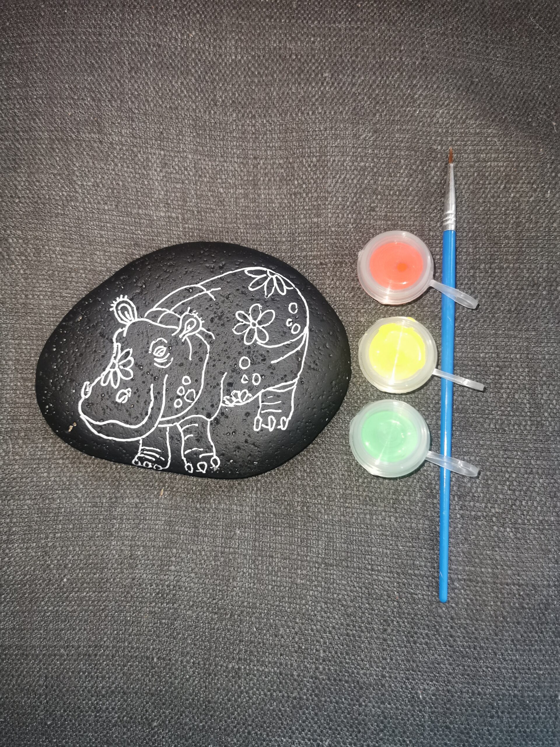 A beautiful black rock with an African wildlife hippo to paint.