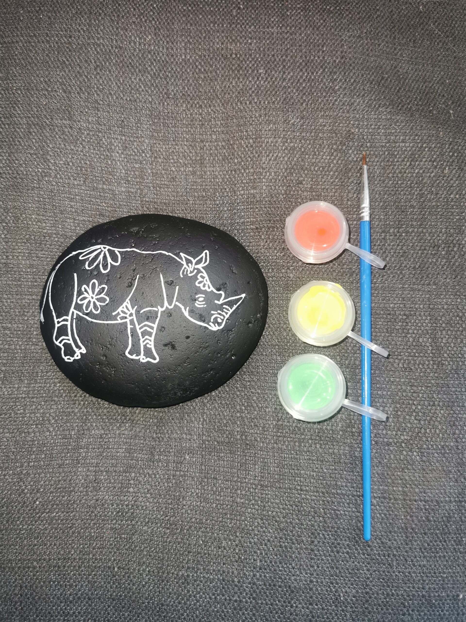A black pebble with an African Rhino to colour in.