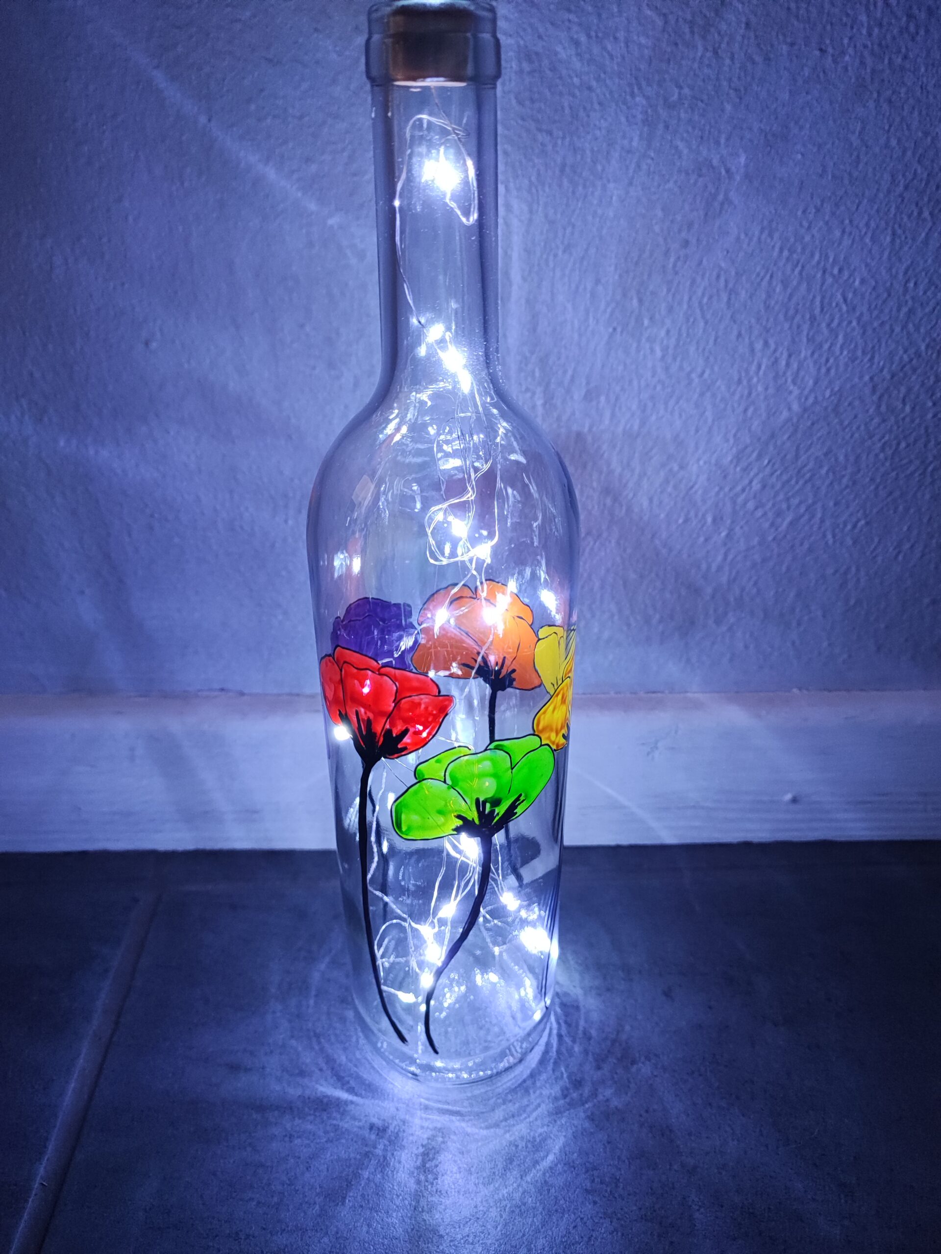 An elegant, hand painted bottle with fairy lights as a gift or for beautiful table décor.